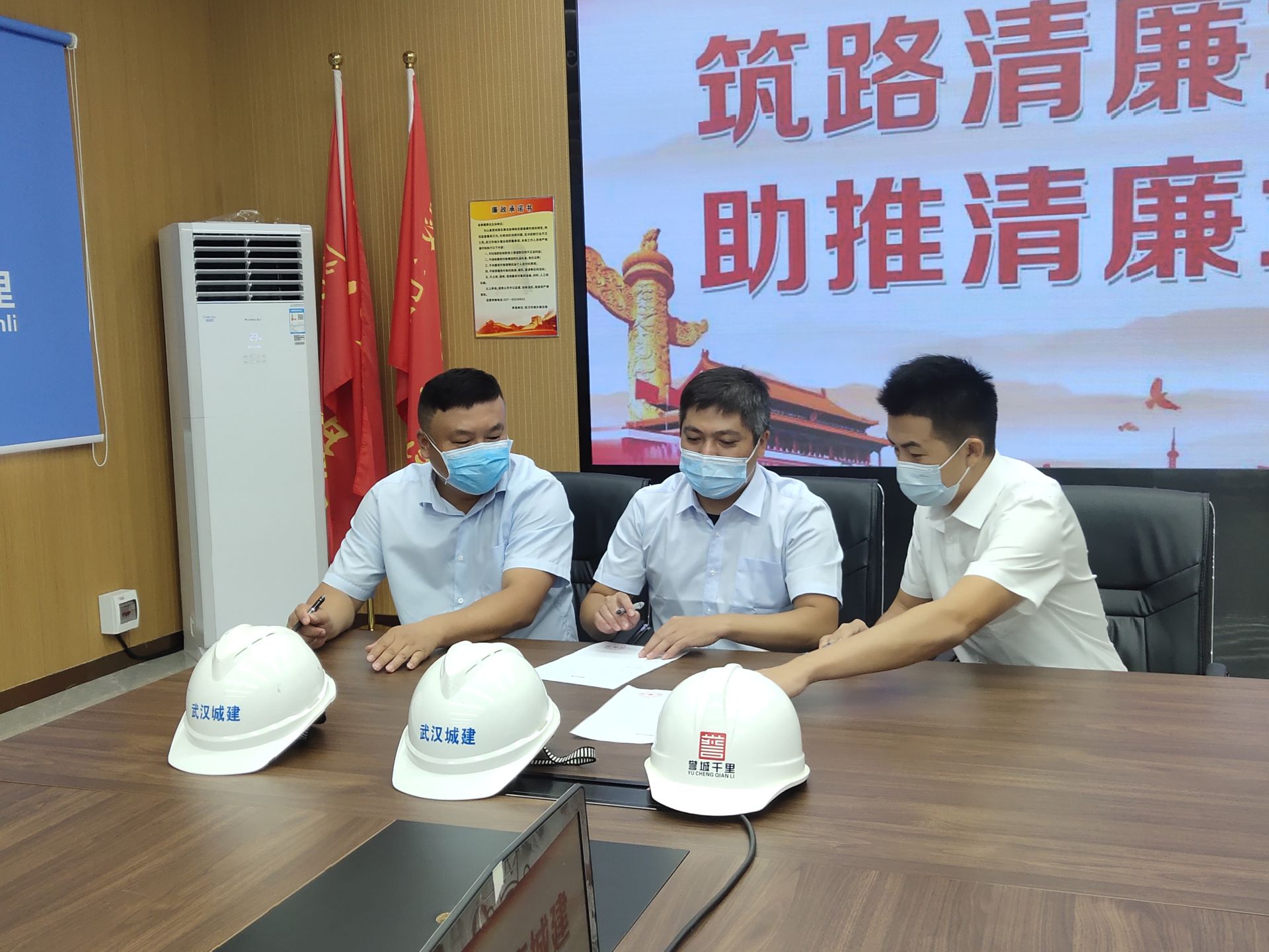 二七路过江通道项目工作会议室内,武汉市城建局纪检干部、执法人员与建设方、施工方负责人同在一张廉政监督卡上签字,并将廉政倡议书、承诺书贴上墙。项目负责人朱成进说:“对我们施工方和职能部门来说,‘两书一卡’起到了互相监督作用,让我们安心搞建设。”