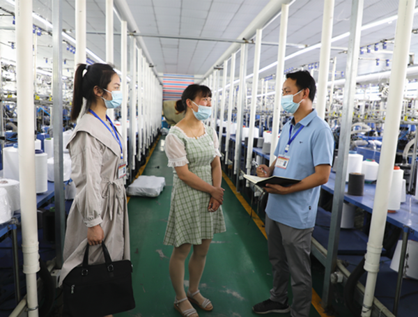 郧阳区纪委监委将实践活动与下沉遍访、优化营商环境等重点工作结合起来,聚焦“户户走到,企企走到”要求,组织区乡两级纪检监察干部深入群众和企业一线,当面听意见、问需求,发现并帮助解决基层群众和企业的急难愁盼问题。图为该区纪检监察干部深入湖北华昶针织有限公司,了解掌握企业生产面临难题,帮助解决企业用工难问题。(饶霖武)