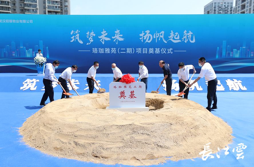 开工仪式上,中国科学院院士、武汉大学校长窦贤康,武汉大学党委常委、副校长李资远,武汉大学校长助理、党政办公室主任徐东兴,洪山区委书记林文书,区长严中兴,区委常委、区委办公室主任杜银川,湖北省农科院院长游艾青,武汉招银物业有限公司总裁谭波等一同挥动铁锹,为珞珈雅苑二期工程培土奠基。