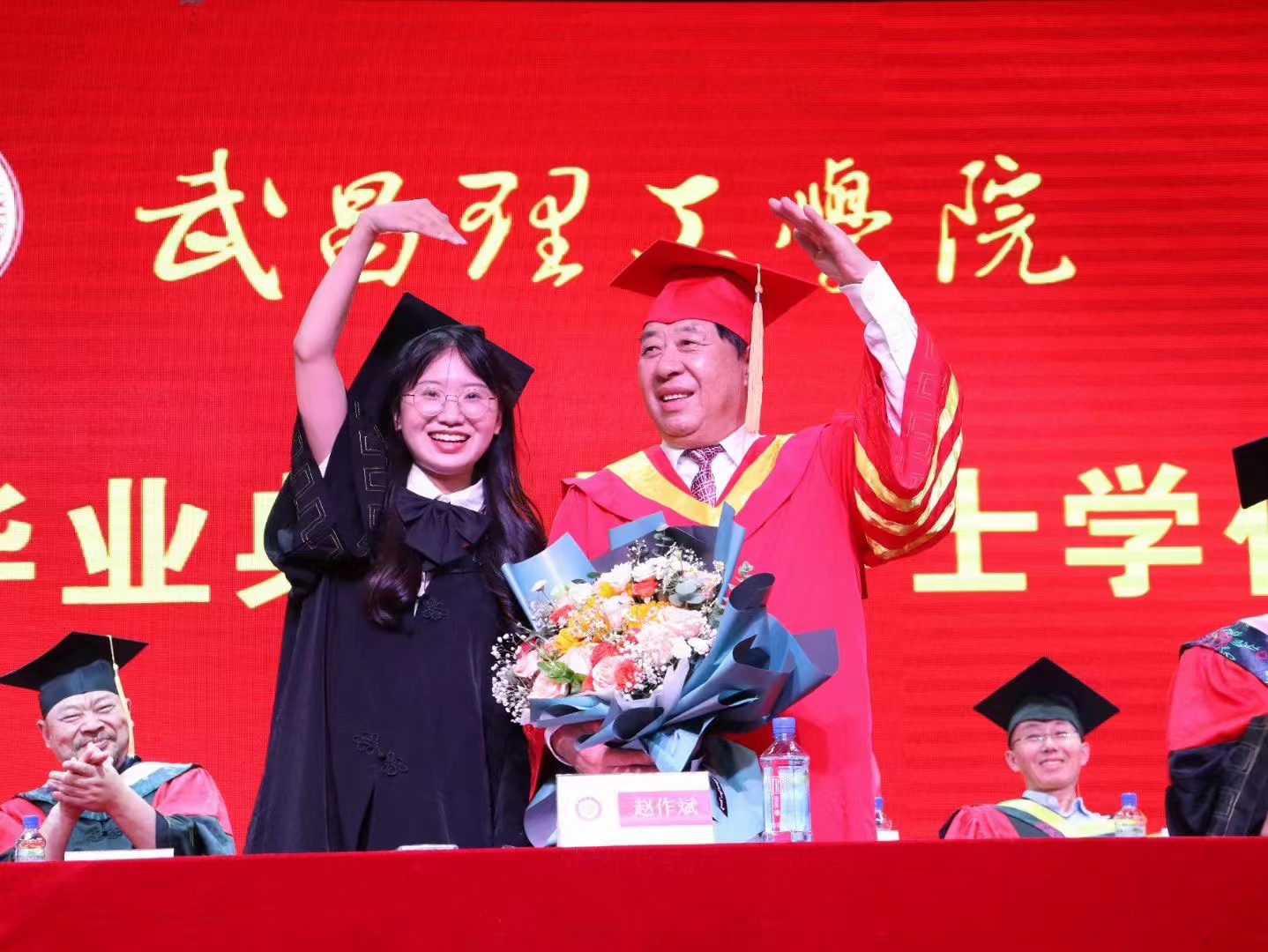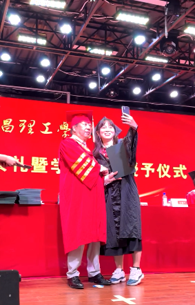 在颁发学位证书的过程中,还充满着很多小“惊喜”。毕业生刘甜甜和校长说,想和校长自拍一张合影,校长欣然同意,看到与校长的自拍照,她充满了喜悦和自豪,一路小跑着下舞台。毕业生武汇曾获得学校最高荣誉“校长奖”,她很感谢校长对她的帮助,专门买了一束花送给校长,并与校长拍了一张“比心照”,羡煞众人。武汇说:“我一路上的点点滴滴离不开学校离不开领导老师们的鼓励、支持与引导。为校长送花,以此表达我的感激之情。和校长的互动,让我看到校长很有童趣,也非常和蔼可亲。现在即将踏上人生的另一段旅程,我不会忘记在武昌理工学院这段人生最美的回忆。”