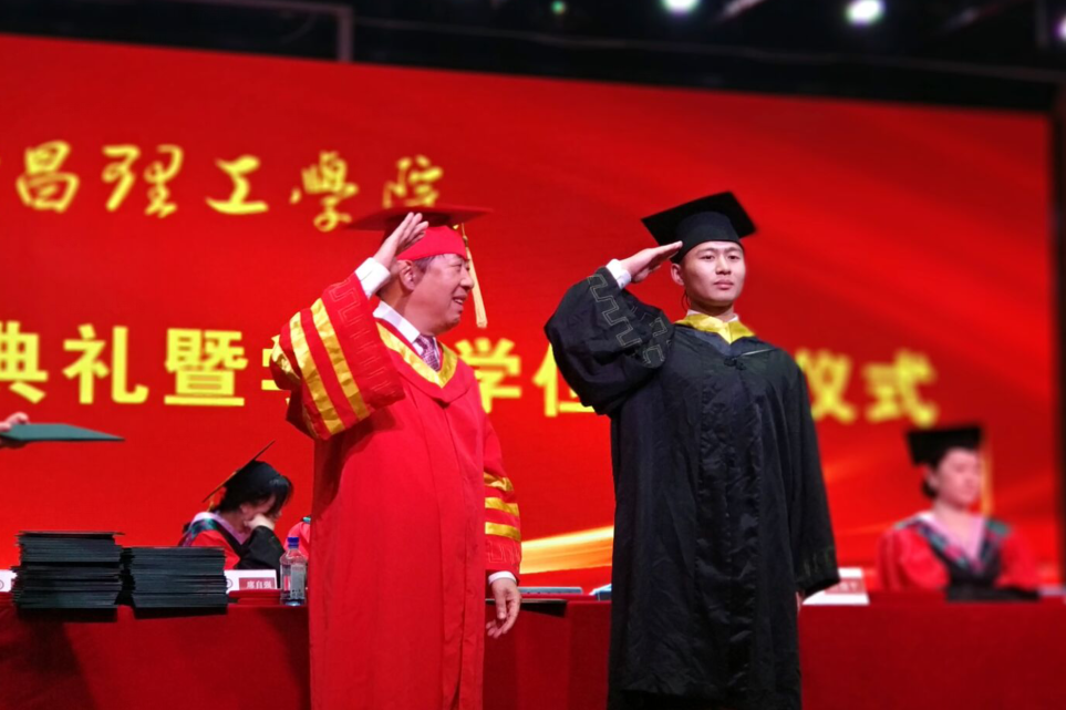 毕业生陈飞飞深刻记得校长在开学典礼中说:如何度过大学的黄金时光,将决定自己的人生高度,人生最后悔的莫过于虚度年华。大学四年,他时刻谨记着这句话,分秒必争,完成专业知识学习之余,积极参与各类活动,取得了240多项成果证书,志愿服务时长超过1700小时。如今,他已经准备好携笔从戎,投身国防事业,实现自己的报国梦。他在和校长合影时对校长表示感谢,并希望和校长一起拍几张“手势照”,他先后摆出了“大拇指”“拱手”“敬礼”等手势,校长也配合地和他一起做,校长认真模仿的样子显得可爱而又和蔼,现场的师生纷纷称赞“校长真亲切,真配合,这届毕业生真会玩!”