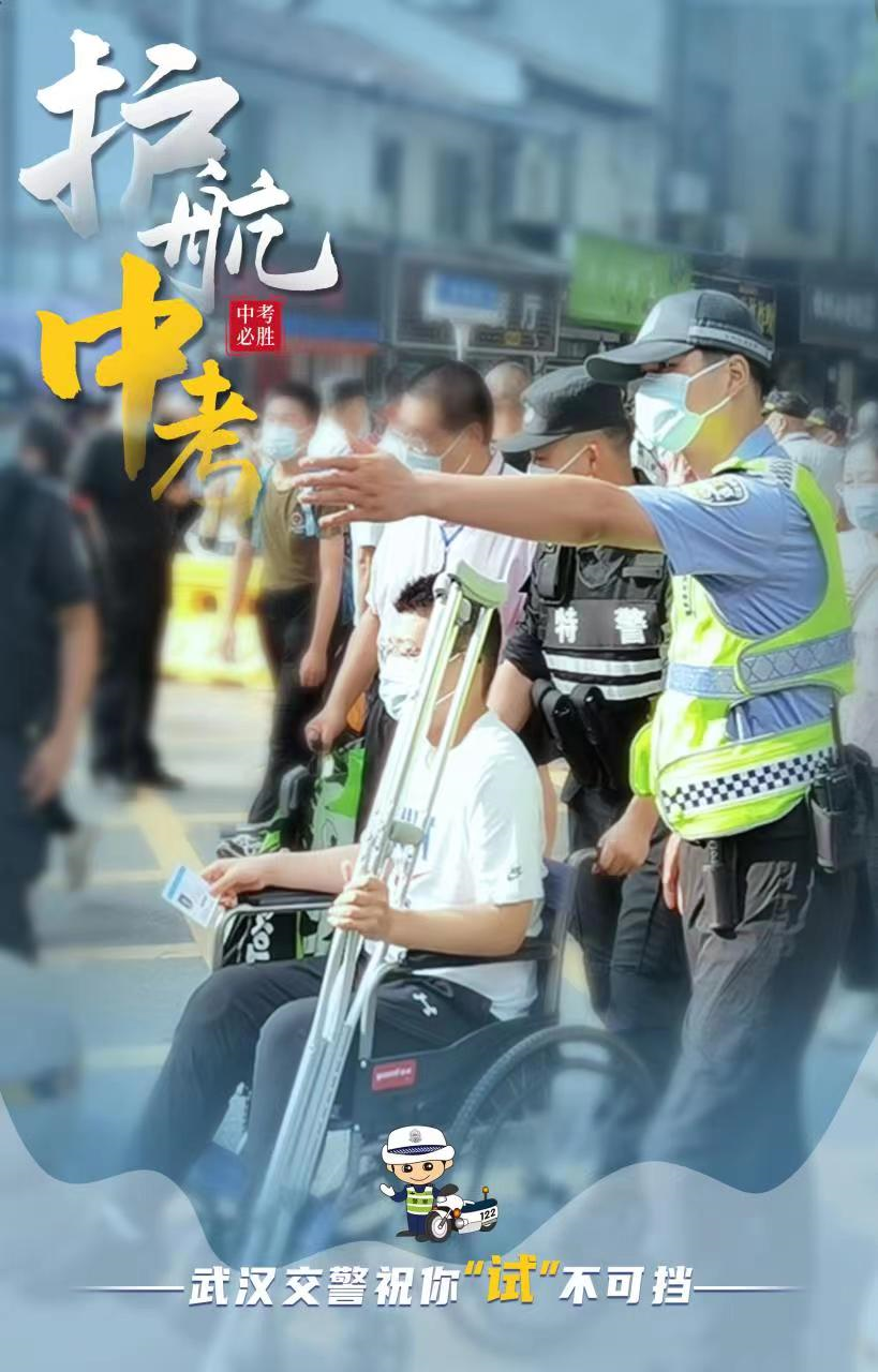 与此同时,光谷交警一中队快骑队员包仕俊、易柏臣在武汉旭光学校中考考点执勤时,发现在距离校门50米处有一名考生坐在轮椅上,家长推着他在人群中缓慢行走。包仕俊见状赶紧上前帮忙,经询问得知考生因腿部骨折,行走不便,家长又无法进入考场正十分着急。包仕俊立即向副中队长潘琤反映情况,潘琤第一时间与考点负责人联系协调开辟绿色通道,随后包仕俊与易柏臣两人合力将考生顺利护送进入考场。