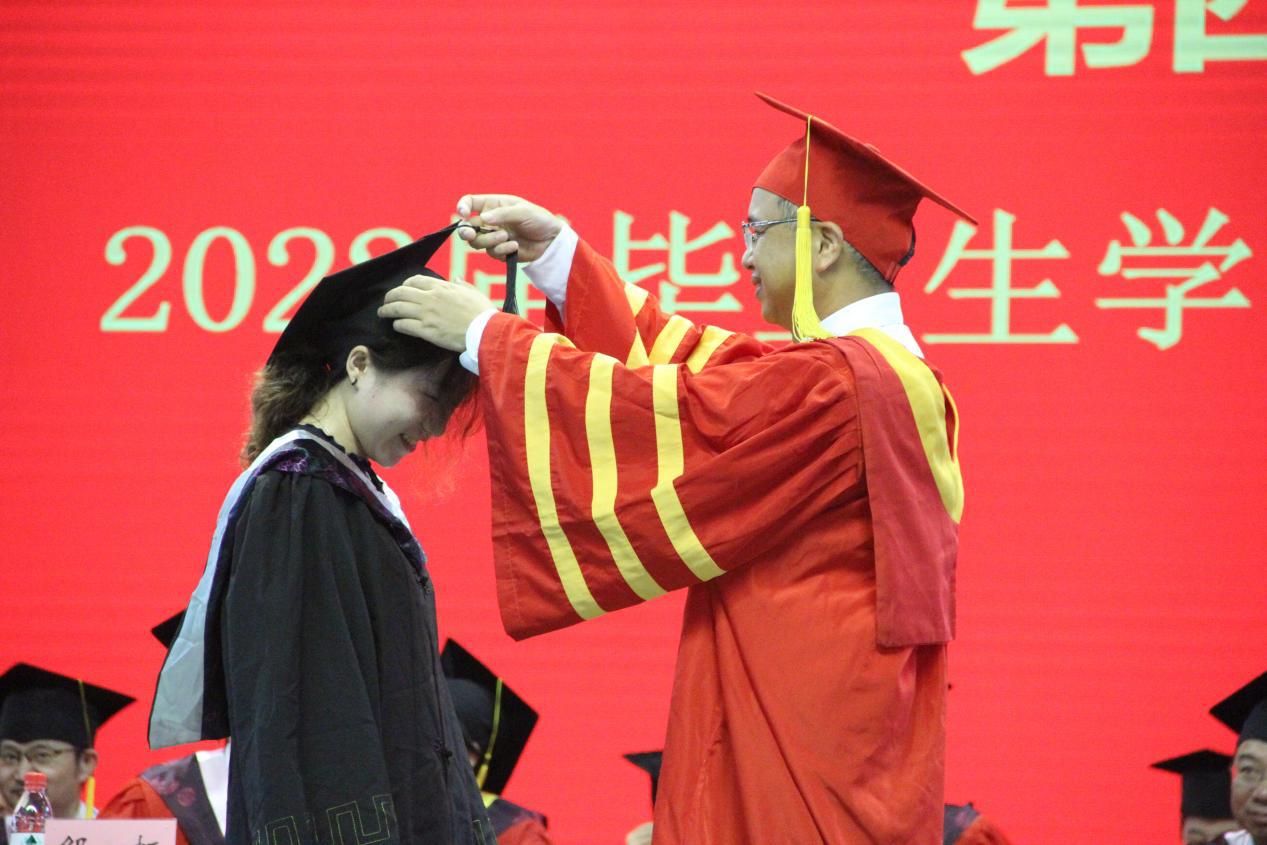 学校党委书记、校长、校学位评定委员会主任潘慧明教授为毕业生代表拨穗正冠并颁发学位证书。