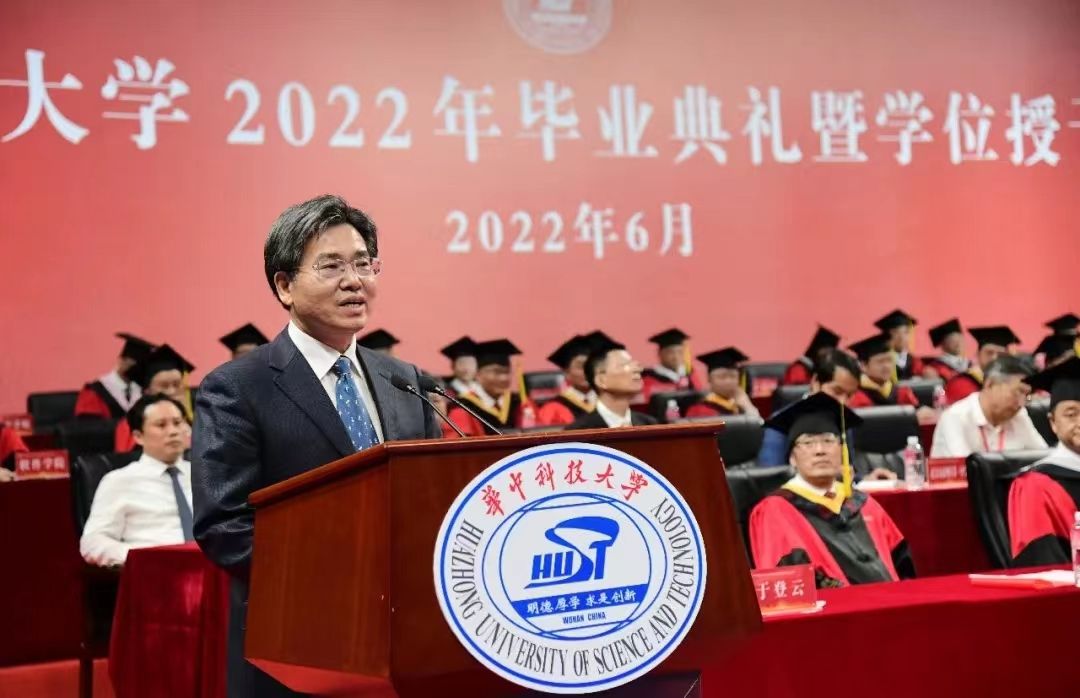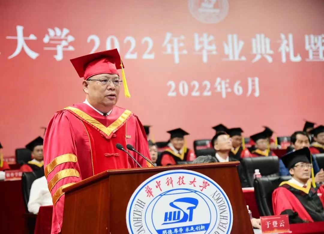 “在世界局势风云变换的时代,面对充满无限机遇和挑战的未来,希望同学们拥抱大时代,胸怀大格局,展现大作为,彰显大情怀,在迈向第二个百年奋斗目标的新征程中谱写青春华章。”校长尤政以《拥抱大时代 一起向未来》为题,发表毕业致辞。回顾华中大70年校史,尤校长深情讲述到“华中大70年来坚持‘顶天立地,追求卓越’。‘顶天’就是心中有理想,‘立地’就是脚下有方向,而‘追求卓越’则是一种精神上的跃迁,不断超越自我,精益求精,从优秀走向卓越”,鼓励同学们应该坚持华中大的优良传统,顶天立地,追求卓越,勇当服务国家振兴伟业的栋梁之才,争做堪当民族复兴重任的时代新人。