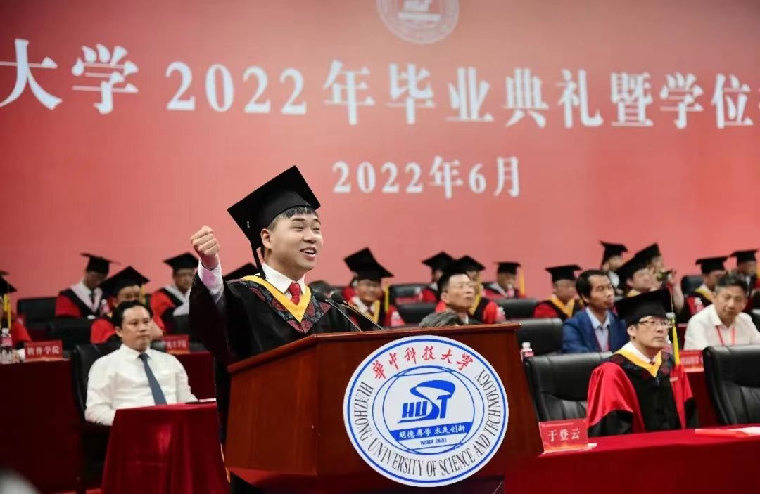“不论是70年前抗美援朝志愿手术大队的不计生死,亦或是近年新冠肺炎疫情中华中大师生的挺身而出,还是奉献青春的党员先锋队,守卫边疆的入伍大学生,奔赴基层一线的研究生支教团,利用自己的专业助力乡村规划、科技扶贫、品牌运营的扶贫学子们,我们都在用自己的奋斗绽放着无悔青春,未来,无论在科技前沿、在三尺讲台、还是在基层一线,我们定会接过接力棒, 一起展现华中大的责任与担当!”本科毕业生代表、材料科学与工程学院秦澜浩深情回忆自己四年本科生活,号召同学们到祖国最需要的地方去,争做堪当民族复兴众人的时代新人,勇当服务国家振兴伟业的栋梁之才。