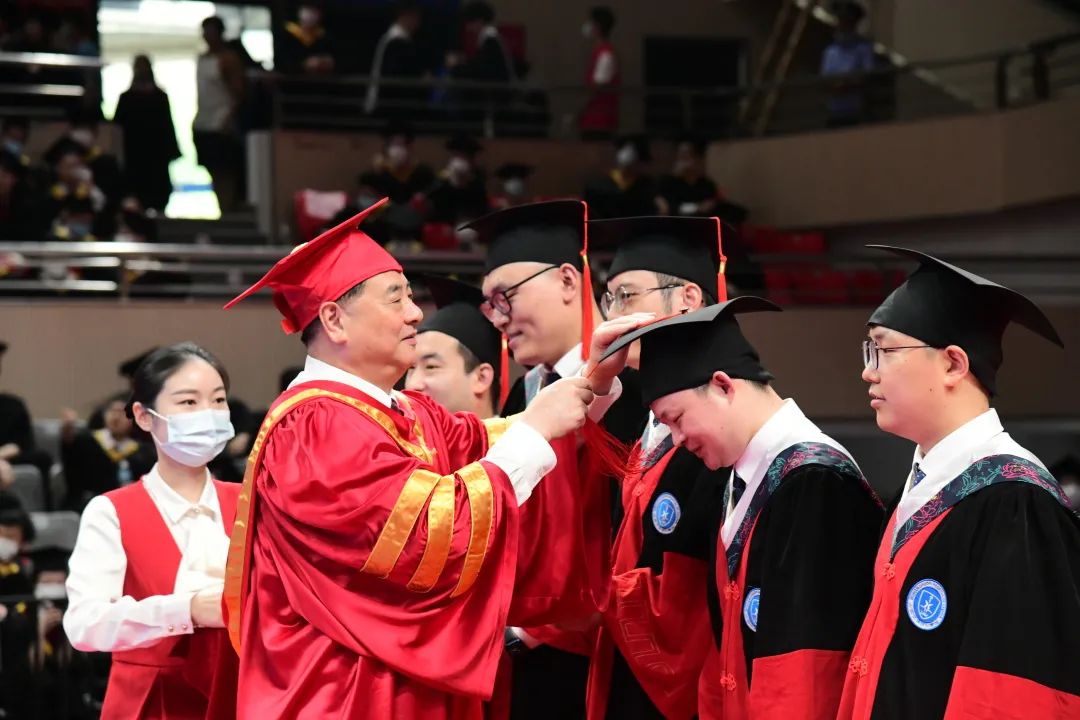 毕业典礼后,校领导和院系负责人分别为现场毕业生一一授予学位,拨穗正冠,握手祝福并合影留念。