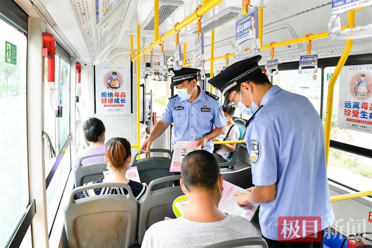 保康民警和禁毒社工在公交车上向乘客宣传禁毒知识(通讯员欧阳智慧摄)