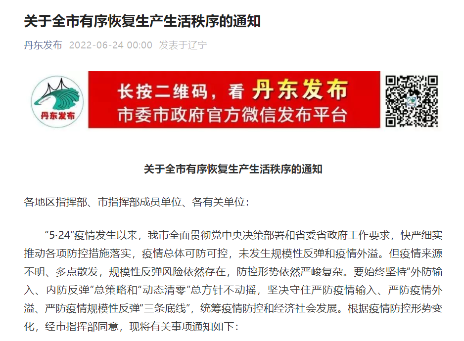 6月24日0时许,辽宁省丹东市发布《关于全市有序恢复生产生活秩序的通知》。通知称,丹东全域仍然作为防范区进行管理,非必要不离丹。除封控区、管控区的居民外,其他居民可凭48小时核酸检测阴性证明在全市有序流动