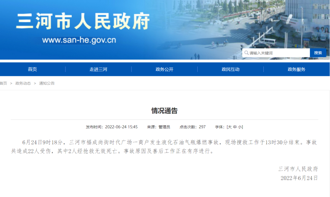 据三河市人民政府网站消息,6月24日9时18分,三河市福成尚街时代广场一商户发生液化石油气瓶燃爆事故,现场搜救工作于13时30分结束。事故共造成22人受伤,其中2人经抢救无效死亡。事故原因及善后工作正在有序进行。