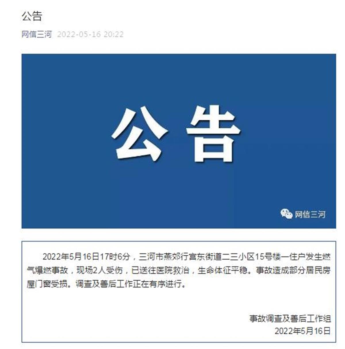 而就在一个月前,三河市同样发生了一起爆炸事故。据极目新闻此前报道,5月16日下午,三河市一小区居民家发生爆炸,有阳台出现垮塌。当地事故调查及善后工作组通报称,16日下午5时6分,三河市燕郊行宫东街道二三小区15号楼一住户发生燃气爆燃事故,现场2人受伤送医救治,事故造成部分居民房屋门窗受损。