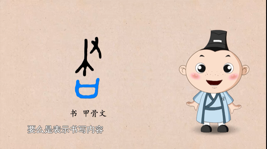 书是一个会意字,它的字形是这样的,左上是一只毛笔,右上角是一只手,表示用手拿着笔写字。下面的口字形,有的学者认为表示的是书写的内容。有的学者认为是墨池或者砚台,表示拿着笔蘸着墨水写字。