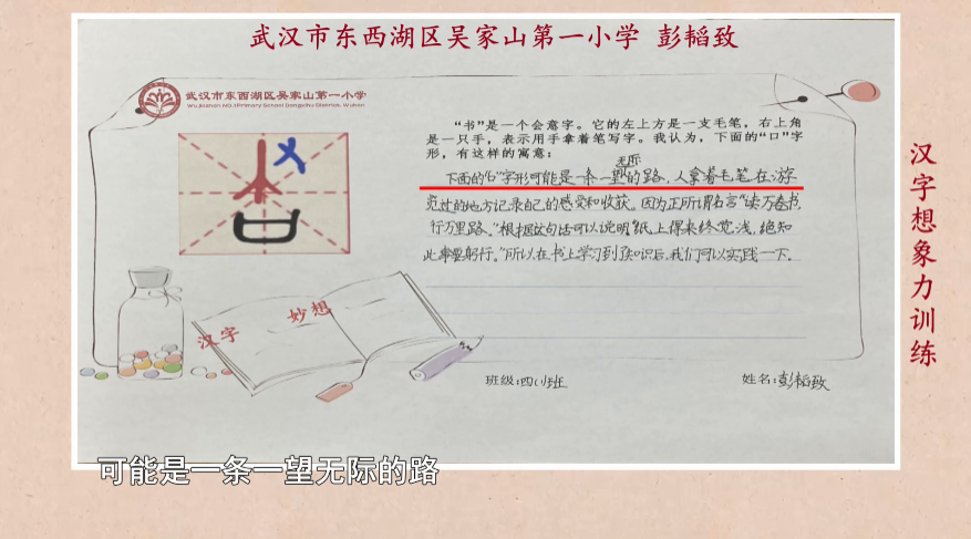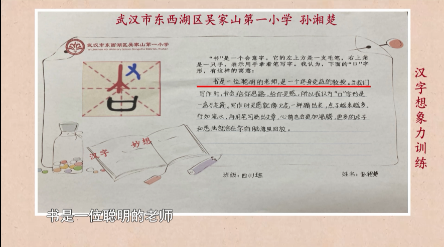 日前,在湖北电视教育频道精品栏目《汉字解密》开展的“小小造字家”汉字想象力训练活动中,来自武汉市东西湖区吴家山第一小学的同学们发挥自己的想象力,向栏目投稿造字作品,并被采用。
