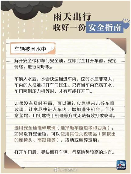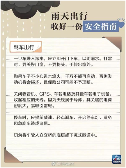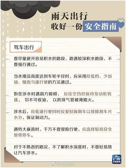 及时关注广播电台及交管部门发布的路况信息,合理规划出行线路和时间。切勿冒险涉水,如必须涉水,尽量沿前车行驶路线,保持低挡匀速通过。
