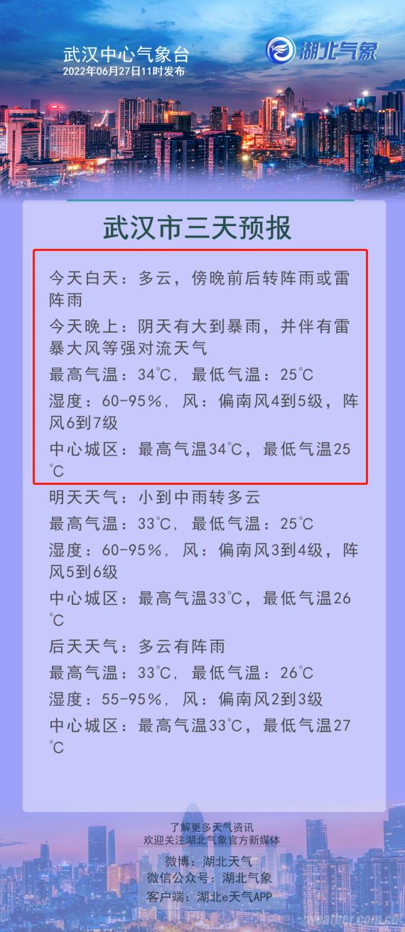 据武汉市应急管理局温馨提示:预计27日夜间开始至28日上午,该市将有大到暴雨,并伴有雷暴大风和短时强降水强对流天气,最大阵风8~11级。请广大市民密切关注气象灾害预警信息,提高风险防范意识,及时停止露天活动和高空户外作业,谨慎出行,加强防护,确保自身安全。