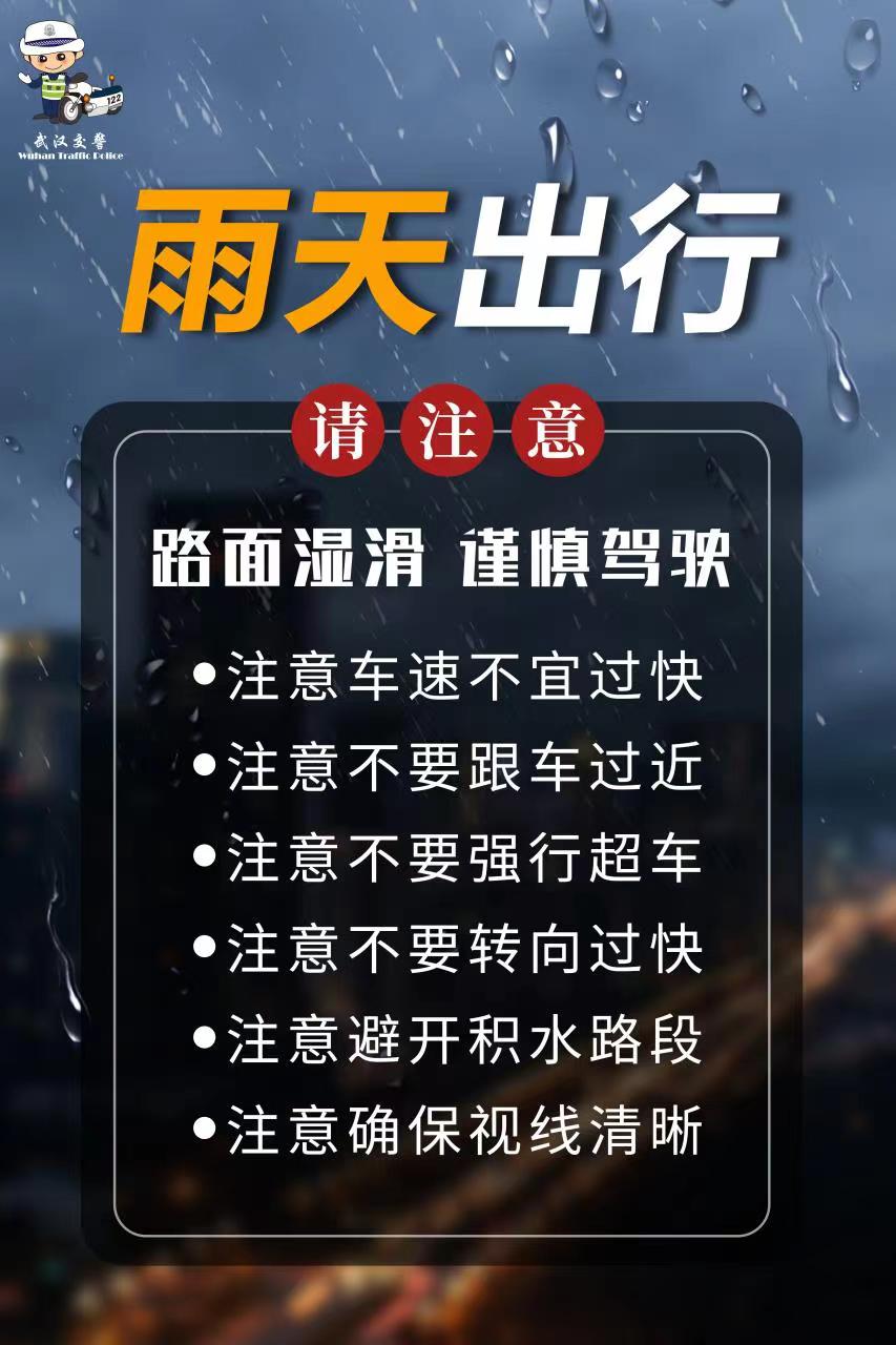武汉交警发布出行预警,建议市民朋友尽量避开强降雨时段外出,合理安排行程,注意交通安全。