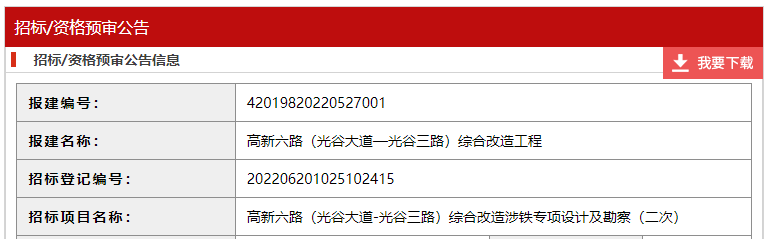 公告信息显示,该路段招标范围为:高新六路(光谷大道-光谷三路)综合改造涉铁范围内的道路工程、桥梁工程、管线工程及其他铁路附属工程的勘察工作包括初勘、详勘及后续涉及勘察工作的所有服务;设计工作包括:可研设计(含估算)、初步设计、施工图设计(预算)以及后续工程期间相关技术服务等。