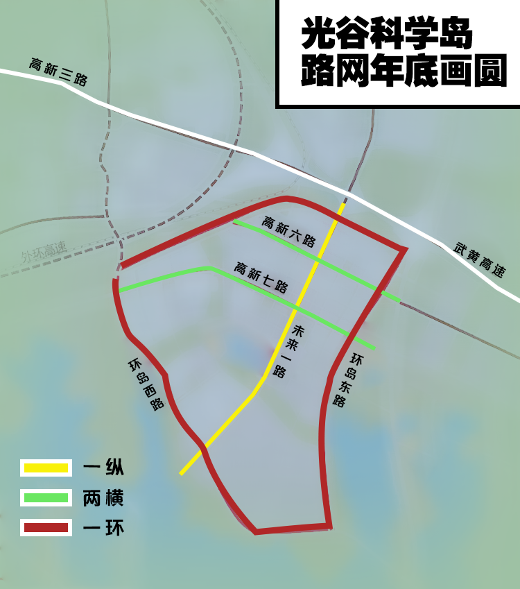 未来一路、高新六路、高新七路、环岛北路、环岛东路、环岛南路、环岛西路等7条道路在内的“一纵两横一环”,岛内道路年内将“画圆”。路网的“一纵”是未来一路,为岛内南北向的交通主动脉,也是一条景观大道。“两横”为“一路向东”的高新六路、高新七路,横贯岛内,未来将“直通”鄂州。