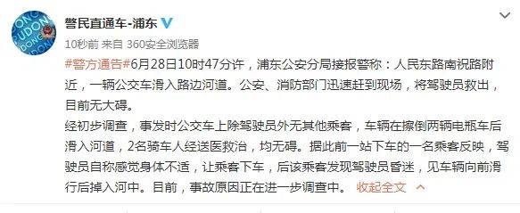 6月28日10时47分许,浦东公安分局接报警称:人民东路南祝路附近,一辆公交车滑入路边河道。公安、消防部门迅速赶到现场,将驾驶员救出,目前无大碍。