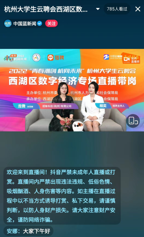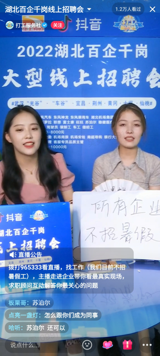 在抖音,全国人社系统政务账号也发起“dou来云招聘”专项,助力就业帮扶。截至2022年6月28日,已有超60家政务媒体参与、1000多家用人单位提供超20000个就业岗位。各地人社局联动当地企业通过人社政务号进行系列直播,累计已开播超50场,实现岗位精准触达。甘肃省人社厅、甘肃省人力资源市场官方抖音号陆续开展了招聘活动三场,累计352家用人单位报名参会,提供就业岗位1.6万个,总观看人次超过22万,收到投递简历1600份。湖北广电打工服务社官方抖音号开展了两场大型线上招聘会,推出十几家湖北知名企业,累计观看人数超5万人,收到简历投递千余份。除此之外,浙江广电@中国蓝新闻、河南广电@大象新闻等多家媒体也相继开播,线上直播带岗助力2022就业季。