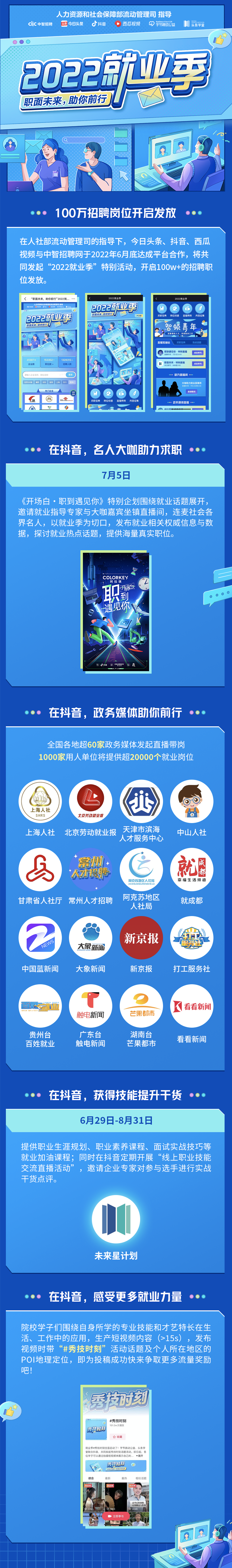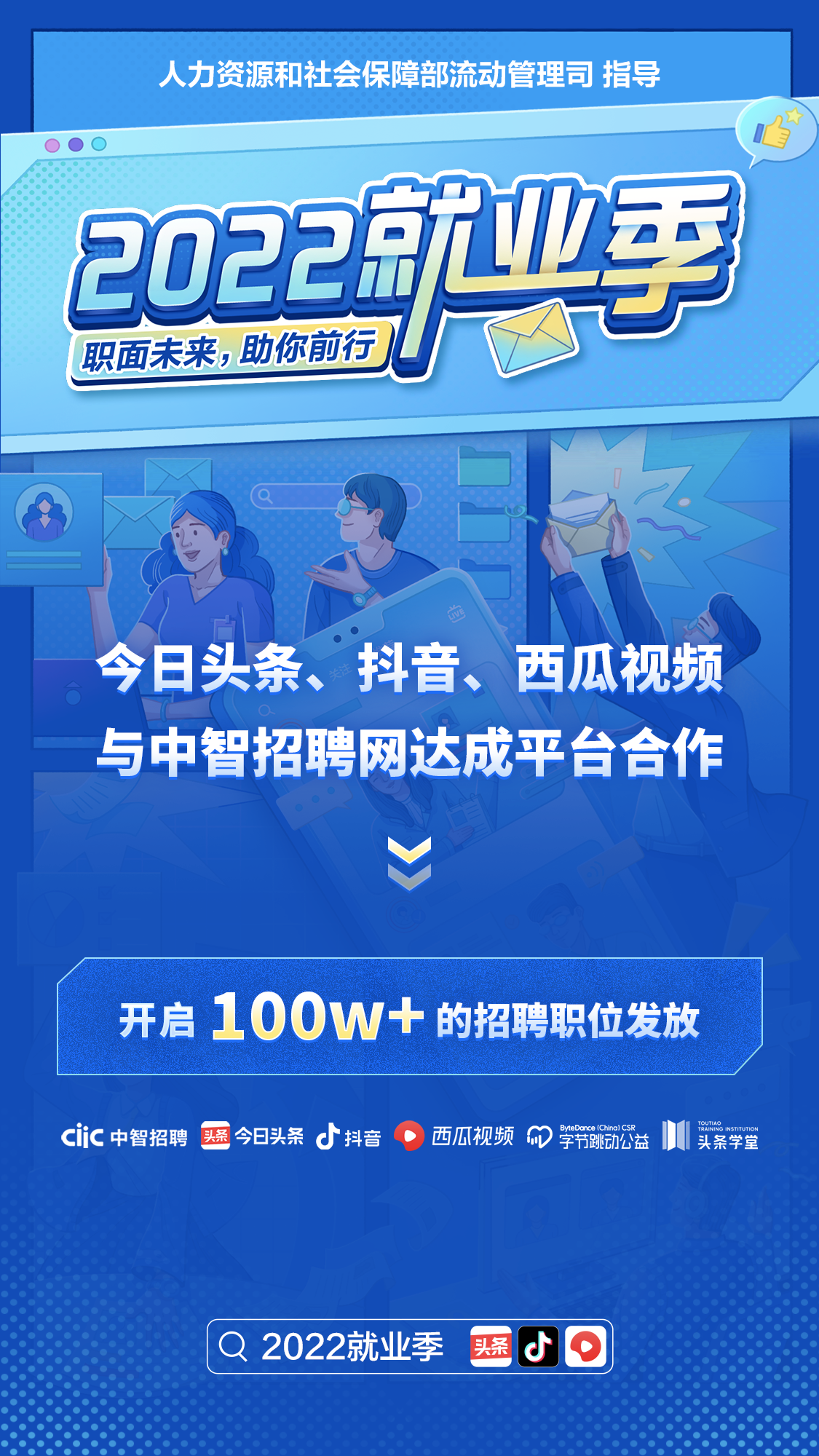 在人社部流动管理司的指导下,今日头条、抖音、西瓜视频与中智招聘网于2022年6月底达成平台合作,共同发起“2022就业季”特别活动,开启100w+的招聘职位发放,通过双方的平台力量与资源优势,助力就业群体建立积极就业观,为切实保障就业贡献力量。