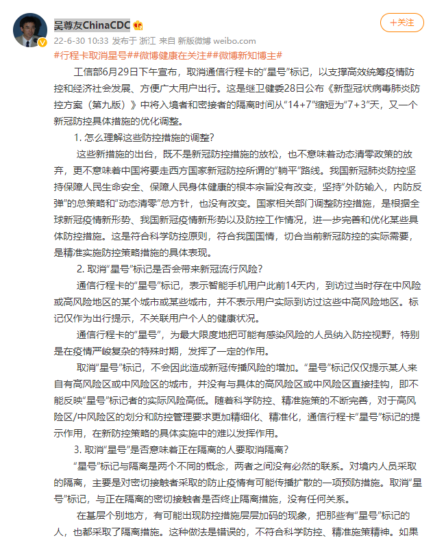 中国疾控中心流行病学首席专家吴尊友通过微博发文,解读行程卡“摘星”。