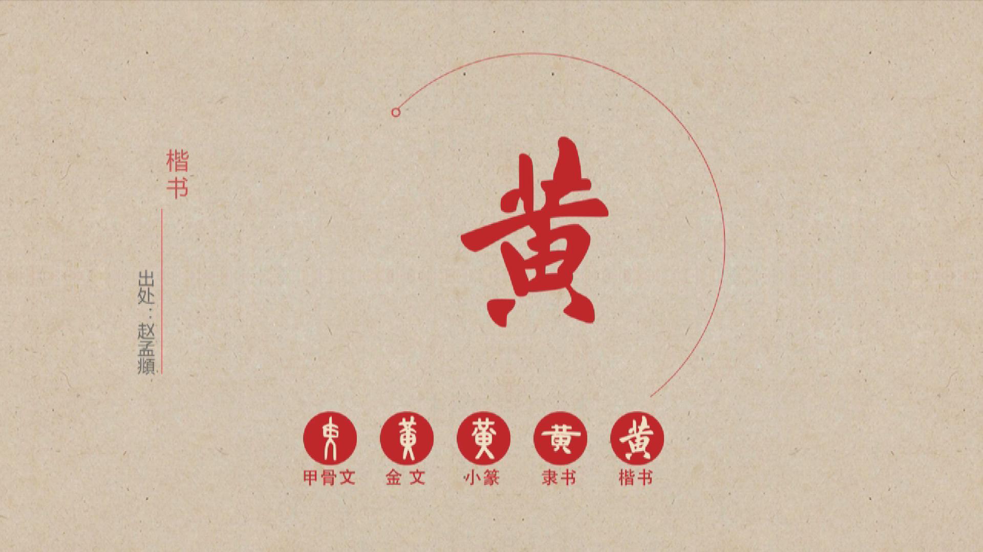 在甲骨文中,“黄”这个字形像一张野兽的皮,上部为头,中间为腹,下部为腿。金文中的黄字和甲骨文有了较大的变化,字形笔画更加线条化了,而原先的象形意味则渐渐消失,小篆的字形承袭了金文字形,笔画进一步平直。唐代楷书中的“黄”,已经和我们今天常见的“黄”字十分接近了。