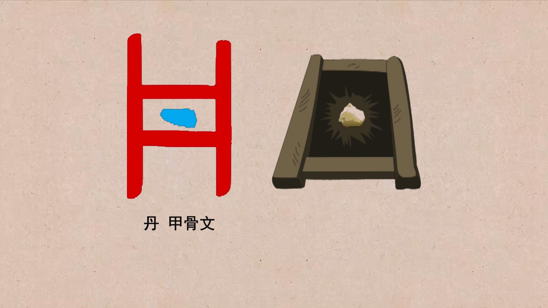 在最初的时候“丹”这个汉字,所表示的是一口井,在这个井当中有一点,表示从矿井中踩到一种石头,这个石头叫“硃砂”,硃砂是一种红颜色的矿石,所以“丹”的甲骨文字形就是从矿井中采出的硃砂。在古代最早的字书《说文解字》里,“丹”的注解是:“丹,巴越之赤石也。”