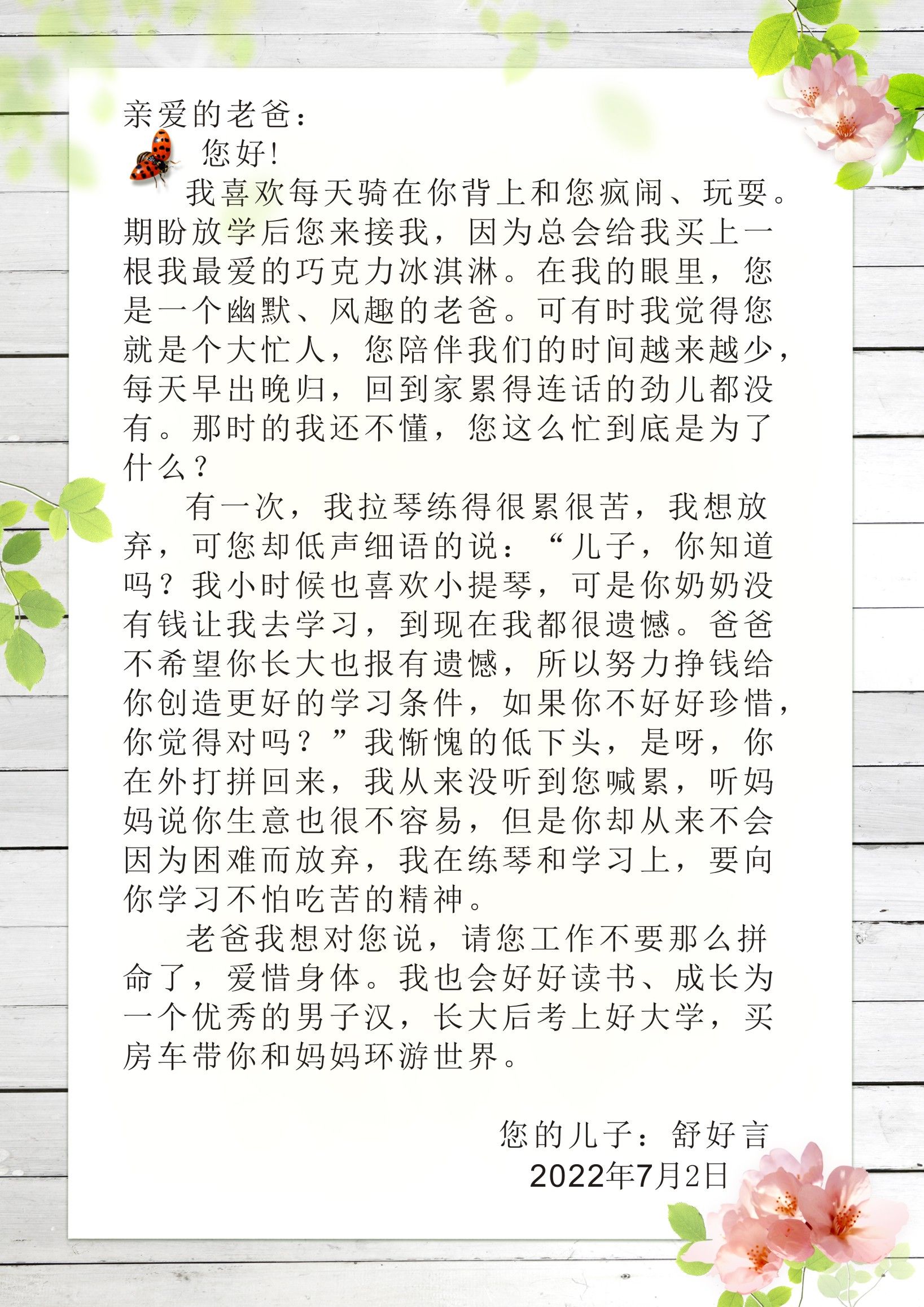 今天,“少年领读者·一封家书”编辑组收到了来自武汉市同济附小一年级4班舒好言同学的一封信。