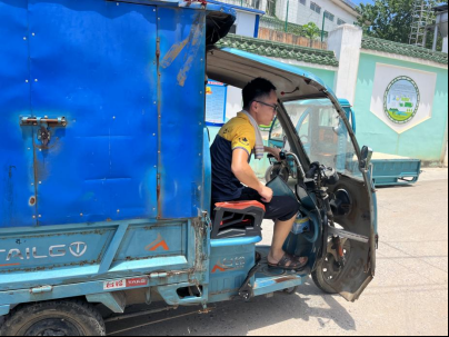 石珍财工作起来轻车熟路,几百件快递很快就分拣完毕并装上车。上午11点10分,记者跟随快递员一起坐上了他那晒得滚烫的三轮车,后面车厢内放满了快件,狭小的空间让人觉得闷热。车一开动,热浪袭人,记者穿着防晒衣都觉得热不可耐,而没有采取任何防晒措施的石珍财两只胳膊被“烤”得黝黑,汗从额头一直往下滴,他不时用脖子上的湿毛巾擦拭脸上的汗水。