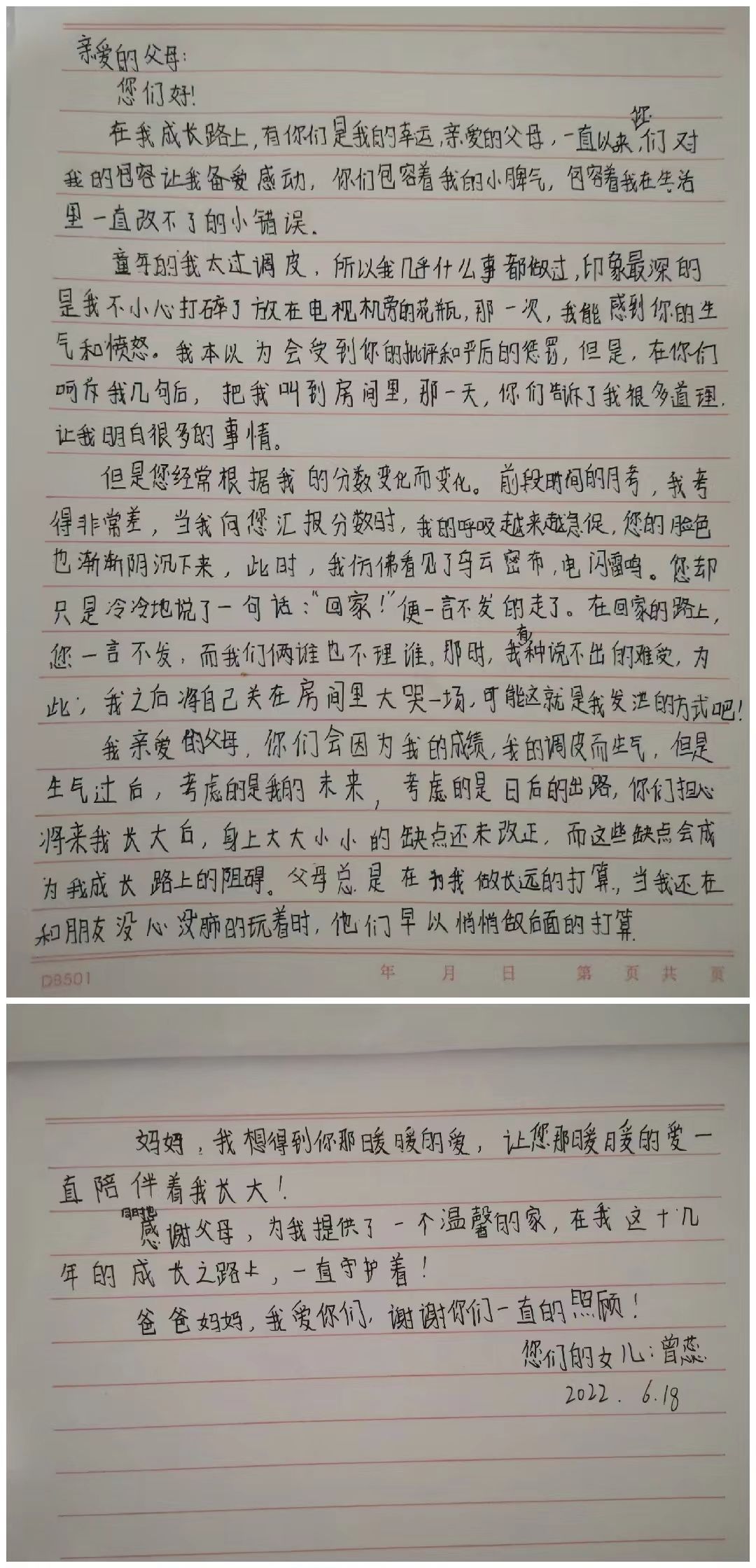 今天,“少年领读者·一封家书”编辑组收到了来自武汉市汉铁初级中学曾蕊的一封家书。