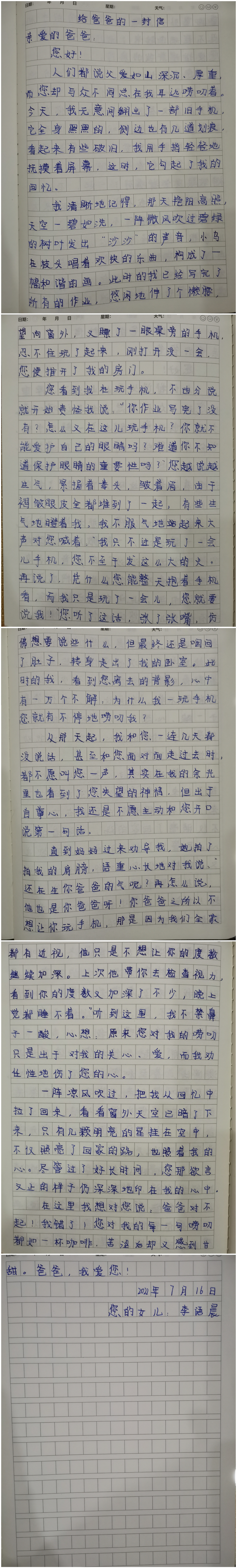 今天,“少年领读者·一封家书”编辑组收到了来自武汉市东西湖区吴家山第四小学李语晨同学写给爸爸的一封信。