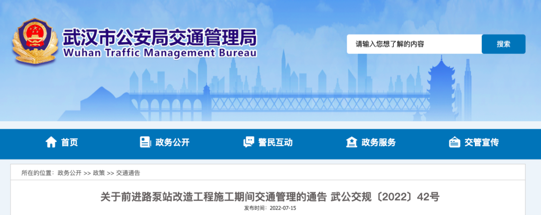 2022年7月23日至2023年7月23日,武昌区前进路将进行前进路泵站改造工程施工。为确保施工顺利进行,施工期间以下路段实行交通管理:●前进路(积玉路至友谊大道)实行机动车由西向东(积玉路往友谊大道方向)单向通行。绕行方案:需通行施工路段的机动车可绕行新生路、健康路、四马路、尚隆路、临江大道、和平大道、积玉路、友谊大道等周边道路。机动车、非机动车驾驶人及行人应服从交通警察指挥及现场管理人员疏导,按照交通信号指示通行。公交营运路线及停靠站点调整,按照《武汉市城市公共客运交通管理条例》规定,另行通告。机动车、非机动车驾驶人及行人应服从交通警察指挥及现场管理人员疏导,按照交通信号指示通行。违反相关通告的,公安机关交通管理部门将依照《中华人民共和国道路交通安全法》等法律法规的规定,予以处罚。