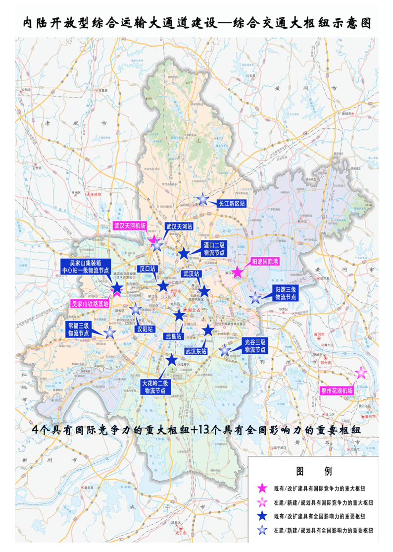 完善13个具有全国影响力的重要枢纽。新建高铁汉阳站、武汉天河站、长江新区站等,形成“五主(武汉站、汉口站、汉阳站、武汉天河站、武昌站)两辅(武汉东站、长江新区站)”客站格局。进一步完善吴家山集装箱中心站一级物流节点和滠口、大花岭二级物流节点,预留阳逻、光谷、常福等货运站场建设条件,形成“1+2+3”三级物流节点网络。