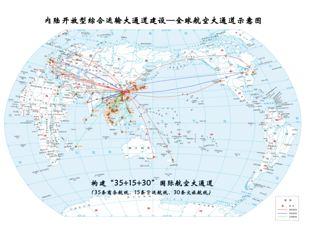 《方案》指出,继续加强机场国际国内航线衔接,构建“35+15+30”(35条商务航线、15条货运航线、30条文旅航线)国际航空大通道。