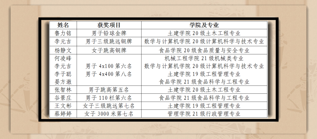 在教练员的指导下,轻工大田径队员展现出良好的竞技状态和拼搏精神。其中,来自土建学院的鲁力铭同学在第一次试投扭伤手指的不利局面下,顽强拼搏,并以绝对优势卫冕男子铅球项目冠军;来自数计学院的李元吉同学除参加单项外,还参加了4*100米和4*400米共4个项目的预决赛,几乎每个比赛单元都有他的项目,在最后一天的男子三级跳远比赛中,他凭借充足的体能储备和良好的临场发挥,摘得一枚铜牌;与此同时,轻工大田径队员在男子4*100米、4*400米两个集体项目以及女子3000米项目上均实现突破,分别取得了第六名、第八名、第七名的好成绩。