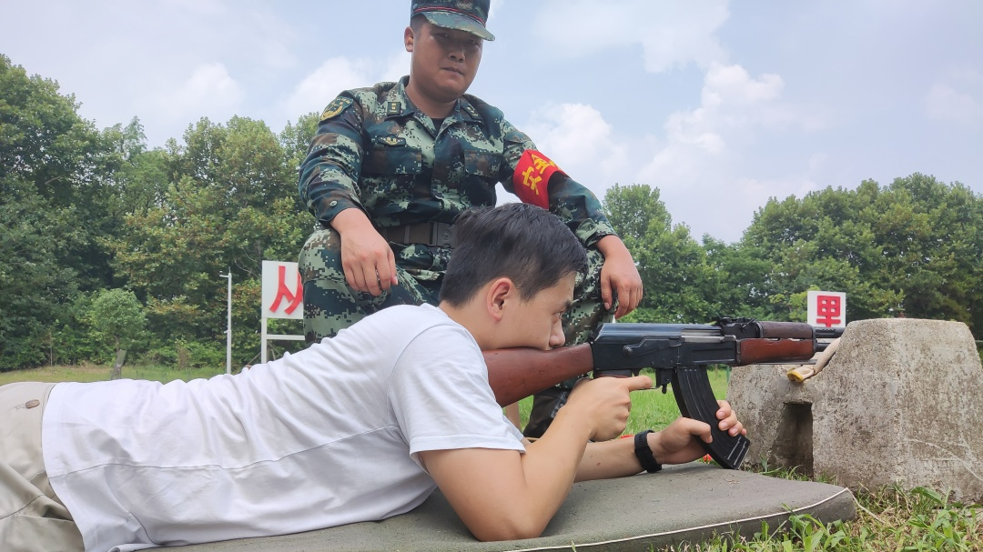 在实弹打靶训练过程中,为了安全和有序训练,每一把射击训练枪支都配有一名安全员,负责指导操作和弹药安装。全体学员在烈日酷暑下使用58式半自动步枪与54式手枪分别进行了射击训练。训练现场,学员们摩拳擦掌、跃跃欲试,既无比激动又有些许紧张,全神贯注小心翼翼地按照动作要领一一体验。连中两次靶心的宋诗伟虽心有余悸但开心地说:“实际操作比想象得要难,有些忐忑,但是手拿枪支就相当于上了战场,只能尽自己最大的努力去做,这也许就是革命先辈们保家卫国时的‘亮剑’精神。”