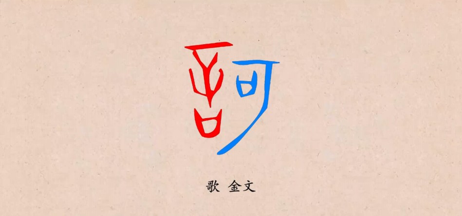 目前发现的最早的“歌”字写法为金文,左边和诗一样都是言,提示字义;右边是可,提示字音的同时,在某种程度上也提示字义,因为可从口、丂,丂表示气舒出,因此可意为气流从口中呼出。所以从“歌”的本源上可以看出“歌”也和言语有关。