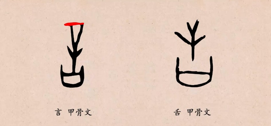 “言”字的甲骨文在“舌”的甲骨文字形上面加了一横。