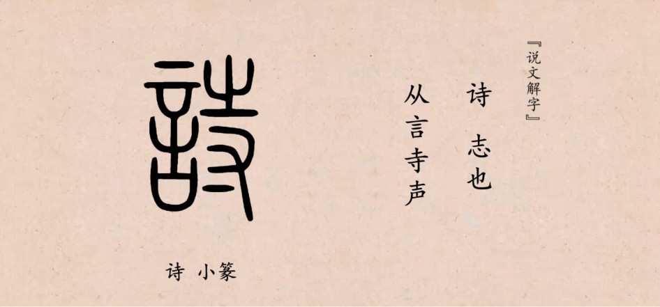 “诗”的小篆字形和甲骨文字形相比更加的规整,《说文解字》对诗的解释是: “志也。从言寺声。”意思是,诗,是心志的流露。