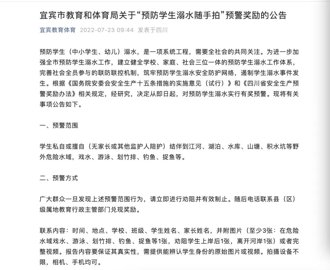7月23日,四川宜宾市教育和体育局发布公告称,针对学生私自或擅自结伴到户外“野游”的情况,群众发现并劝阻制止的,可获得100元以上奖励。而对预警中查证属实的涉事中小学生,一律取消当年评优选先资格,并视情况纳入中小学生综合素质评价档案。