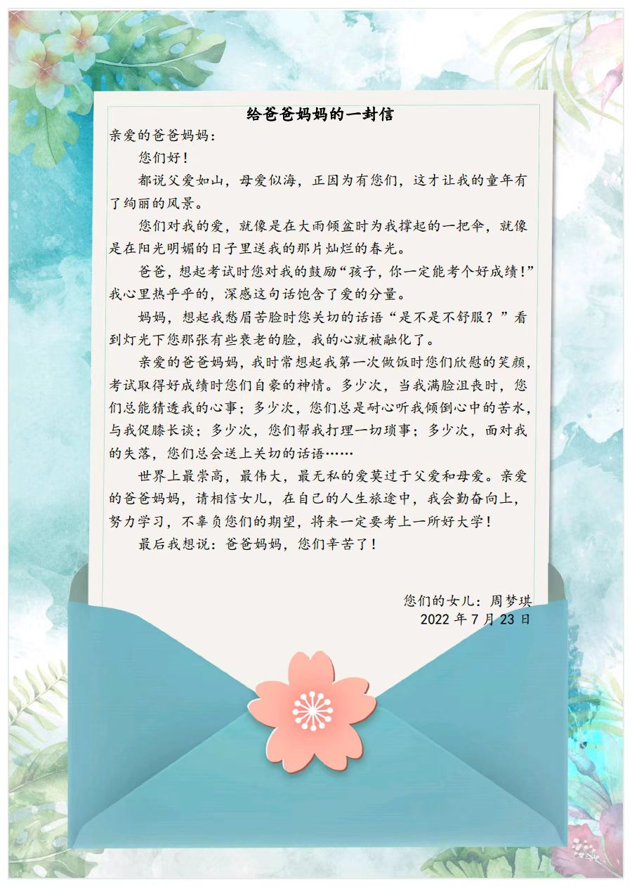 今天,“少年领读者·一封家书”编辑组收到了来自武汉市江夏区金口街道南岸小学周梦琪同学写给爸爸妈妈的一封信。
