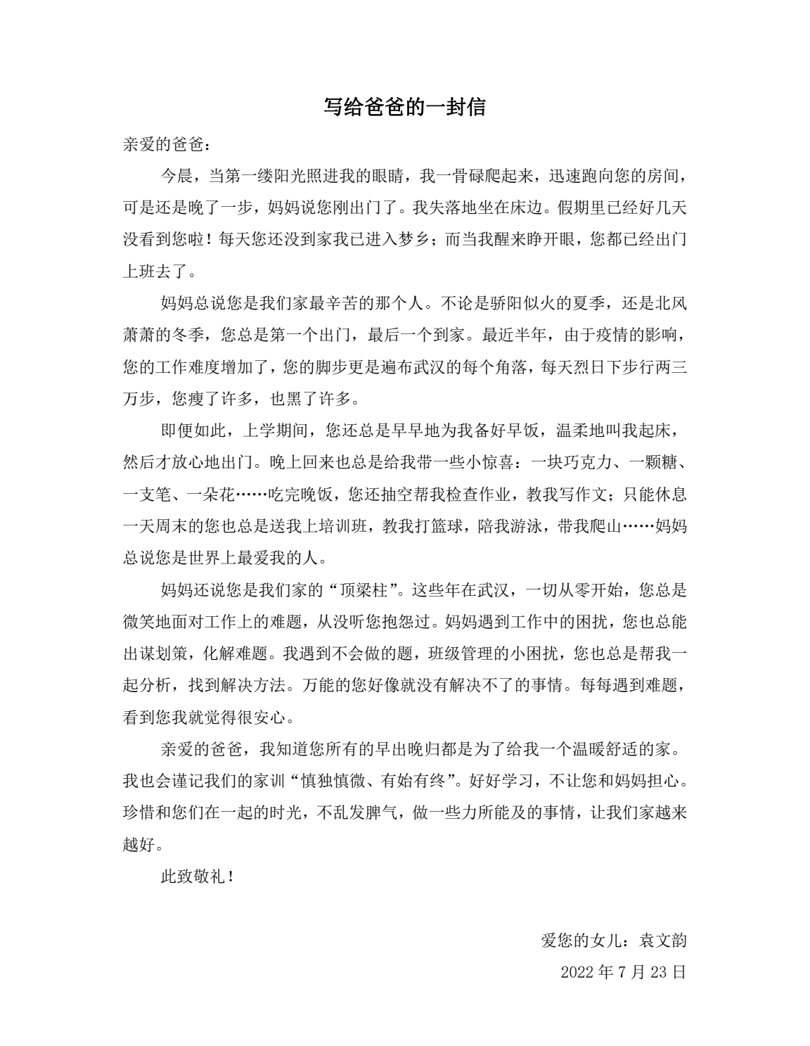 今天,“少年领读者·一封家书”编辑组收到了来自武汉市文化大道小学四(3)班袁文韵同学写给爸爸的一封信。