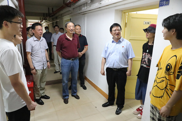 在西9-207宿舍,路海华向同学们介绍,“我是学校新任的党委书记,今天是上班第一天,得知不少同学暑期留校学习,特地来看望大家。”他叮嘱同学们在紧张的学习之余,做好防暑降温,注意安全。“感谢校领导们的关心,我们一定好好学习。”同学们回答。