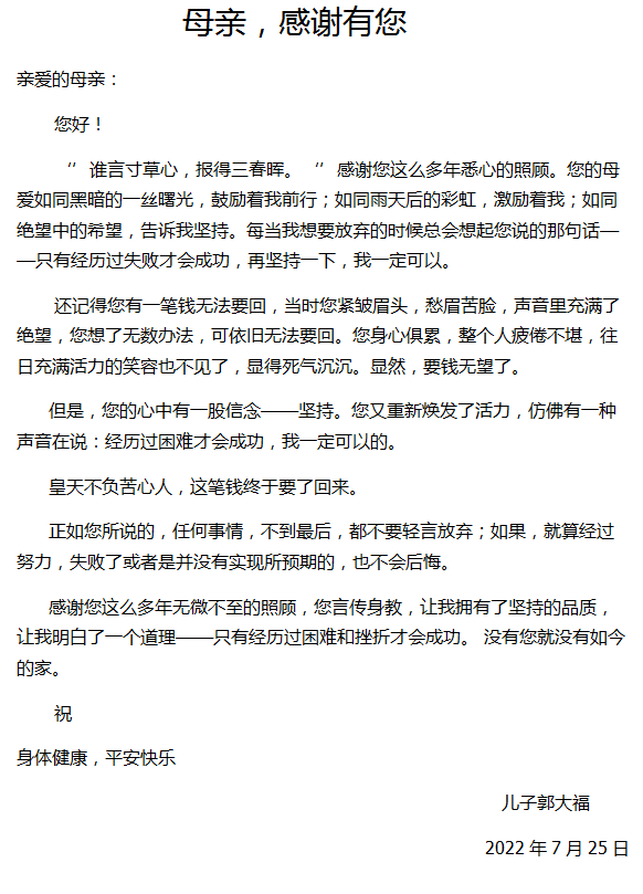今天,“少年领读者·一封家书”编辑组收到了来自武汉市江夏区纸坊第三小学郭大福同学写给妈妈的一封信。