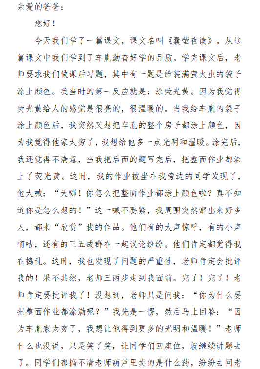 今天,“少年领读者·一封家书”编辑组收到了来自武汉市海淀外国语实验学校张静好同学写给爸爸的一封信。