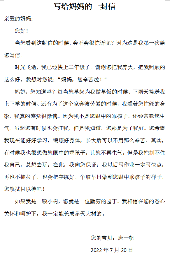今天,“少年领读者·一封家书”编辑组收到了来自武汉市江夏区实验小学体育馆校区一(7)班唐一帆同学写给妈妈的一封信。