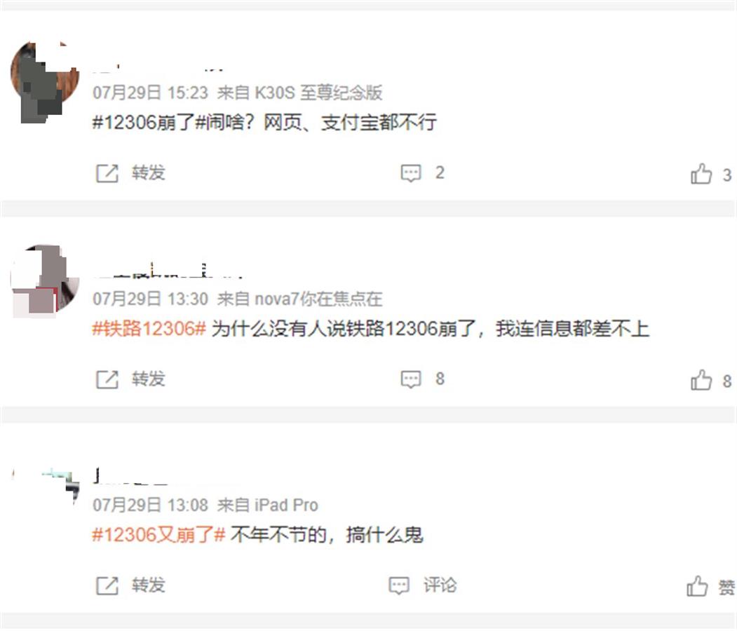 还有网友称,29日上午起晚了没赶上车,结果在火车站临时改签发现“APP崩了”,没办法只有排长队到人工窗口办理业务。还有网友说,12306连续两天出问题,“时不时得崩一下。”