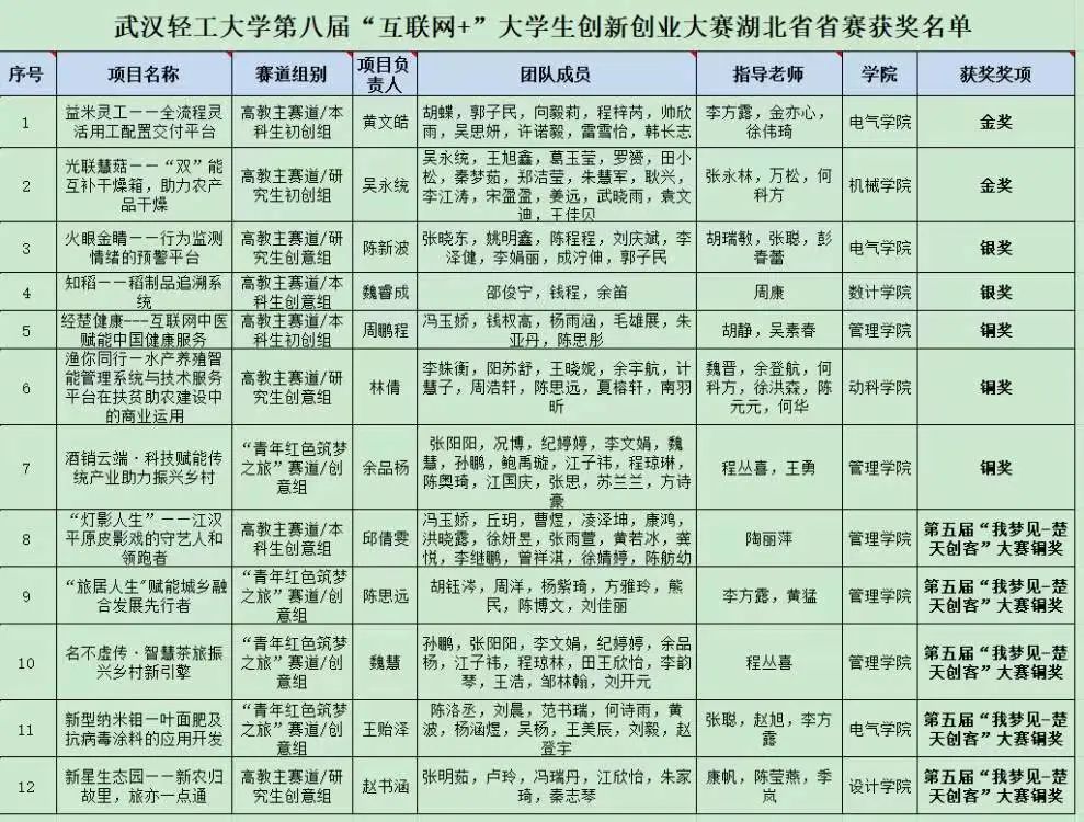 在第八届“互联网+”大学生创新创业大赛湖北省省赛获奖项目中,《益米灵工——全流程灵活用工配置交付平台》(武汉轻工大学电气学院)和《光联慧菇——“双”能互补干燥箱,助力农产品干燥》(武汉轻工大学机械学院)荣获金奖,《火眼金睛——行为监测情绪的预警平台》(武汉轻工大学电气学院)和《知稻——稻制品追溯系统》获银奖,《经楚健康---互联网中医赋能中国健康服务》(武汉轻工大学管理学院)、《渔你同行—水产养殖智能管理系统与技术服务平台在扶贫助农建设中的商业运用》(武汉轻工大学动科学院)和《酒销云端·科技赋能传统产业助力振兴乡村》(武汉轻工大学管理学院)获铜奖。