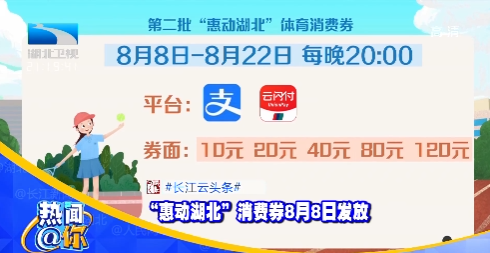 第二批“惠动湖北”体育消费券将于8月8日至22日每晚8点投放,消费者可通过支付宝、云闪付抢券,券面最高120元,适用于入驻平台的健身场馆、体育培训机构和体育用品专卖店。 (来源:湖北广电融媒体新闻中心 责任编辑 潘念) 责任编辑 潘念