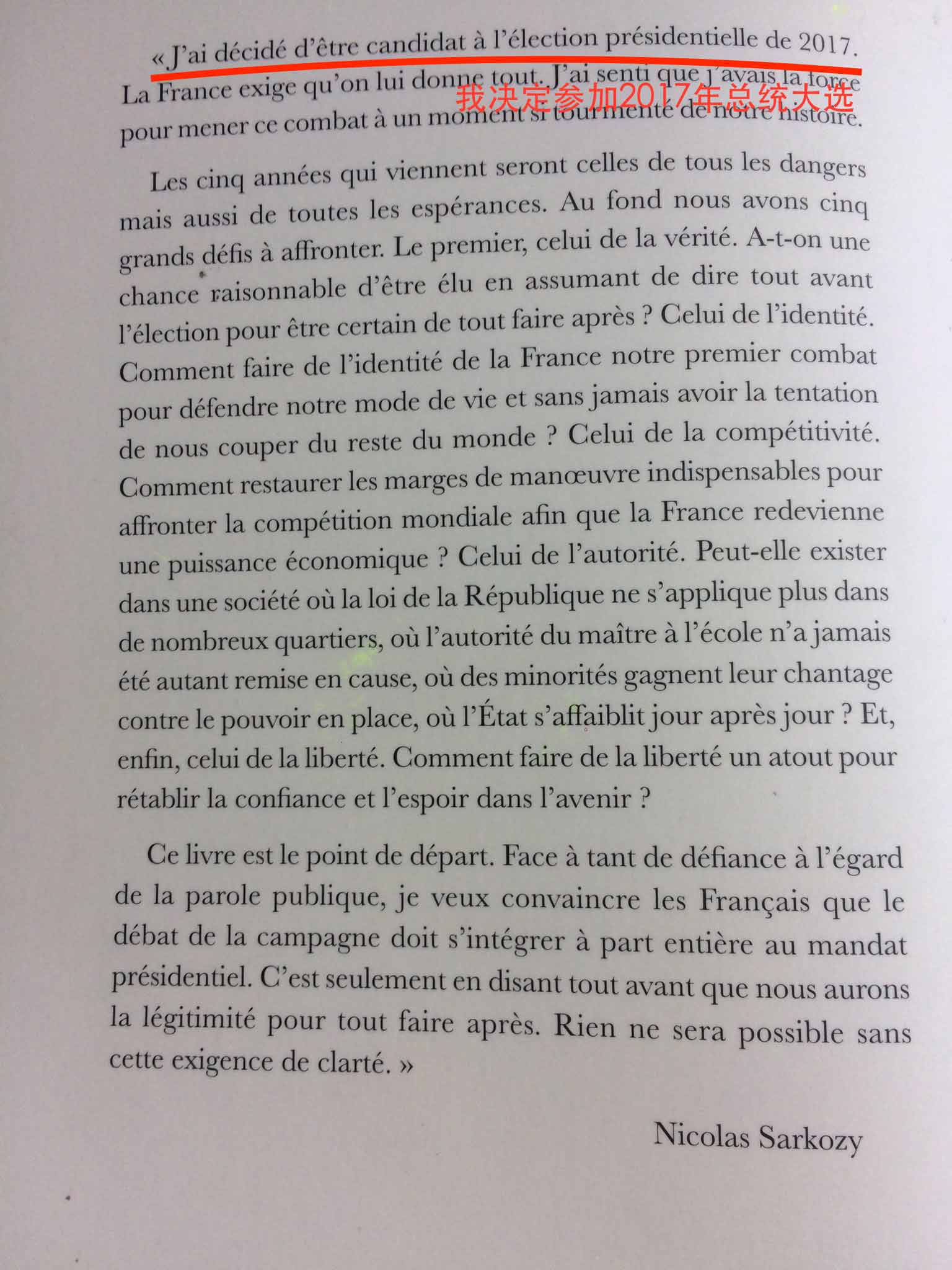 法国前总统萨科齐在出版的新书《一切为了法国》中宣布将参加2017年总统大选 (图片来自网络)